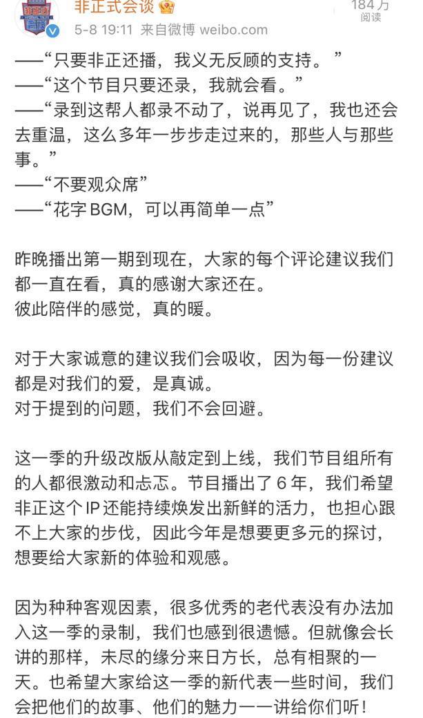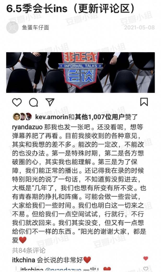 《非正式会谈》6.5季在热度不断出圈的同时,也有许多“爱非”为爱发电,给节目组提出了一些中肯的建议,希望能帮助新一季节目做得更好。《非正式会谈》节目组也在第一时间发布长文,针对网友提出来的问题作逐一说明,并在官博主动上架意见邮箱虚心采纳粉丝建议,让人看到作为高口碑综N代的社会担当感。节目MC大左更是在个人社交帐号上认真地和网友们解释,表现出愿意不断改进的决心,与粉丝双向的奔赴也得到路人点赞!这一步步的用心之处在赢得网友好评的同时,挽回了口碑,不少观众回复愿意给节目组时间来做调整,并感慨道:“这应该是第一个愿意听粉丝意见的节目”!