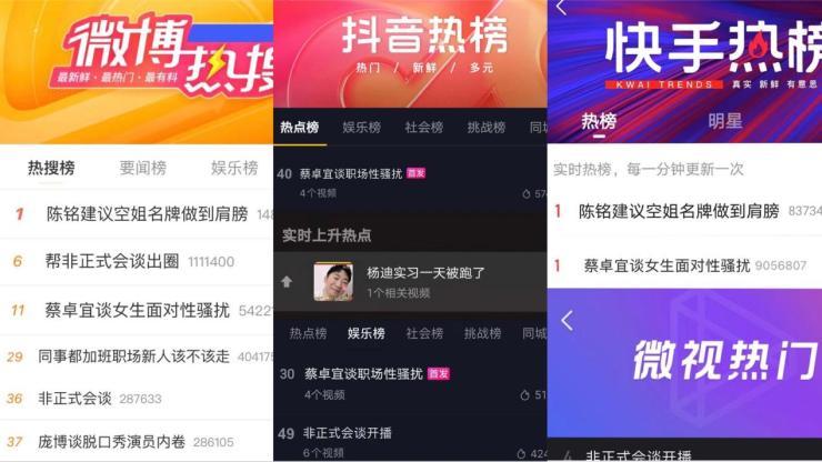 新一季《非正式会谈》强势回归,继续保持往季的高热度和高讨论度,前三期节目播出后,在各大平台热搜不断,引发网友持续关注节目内容。#陈铭建议空姐名牌做到肩膀#霸榜时间超过10小时,登陆微博热搜和快手热搜双榜单top1。#帮非正式会谈出圈#、#同事都加班职场新人该不该走#、#如何看待男色经济#等二十多个节目话题相继登陆微博、抖音、快手等多个平台热搜榜单,在各大新媒体平台引起网友热烈讨论,同期主话题阅读量和讨论量分别达到45亿+和456W+。